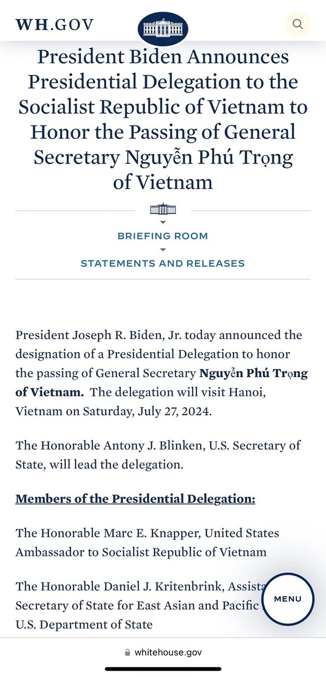 Ngày 27/7 (giờ Việt Nam), Nhà Trắng đã ra tuyên bố cho biết Tổng thống Hoa Kỳ Joe Biden đã công bố việc cử một phái đoàn đại diện tổng thống sang Cộng hòa Xã hội Chủ nghĩa Việt Nam viếng Tổng Bí thư Nguyễn Phú Trọng.