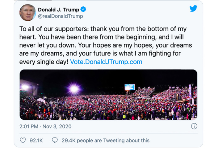 "Gửi tới tất cả những người ủng hộ. Cảm ơn các bạn từ tận đáy lòng. Mọi người đã ở đó ngay từ đầu, và tôi sẽ không bao giờ để mọi người thất vọng. Hy vọng của mọi người cũng chính là của tôi. Giấc mơ của mọi người là giấc mơ của tôi. Tương lai của mọi người là điều tôi đang đấu tranh mỗi ngày", Trump cho hay.