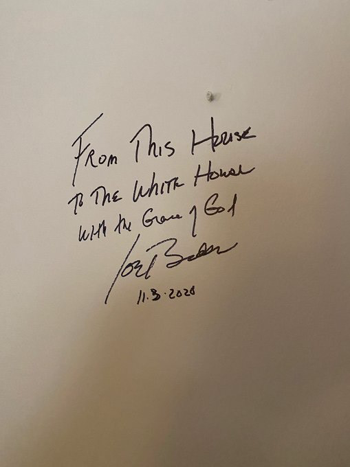 Trong chuyến thăm ngôi nhà thời thơ ấu tại thành phố Scranton, bang Pennsylvania, ứng viên Dân chủ Biden ký lên bức tường trong phòng khách, với dòng chữ: "Từ ngôi nhà này đến Nhà Trắng, nhờ ơn Chúa. Joe Biden 3/11/2020".