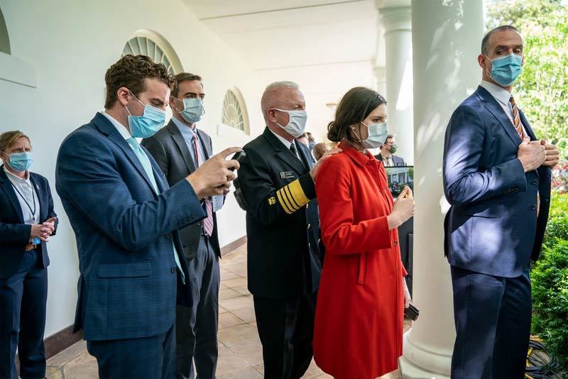 Theo New York Times, trong cuộc họp báo buổi chiều của ông Trump, nhiều trợ tá cấp cao của Nhà Trắng xuất hiện ở rìa Vườn Hồng và tất cả họ đều đeo khẩu trang.