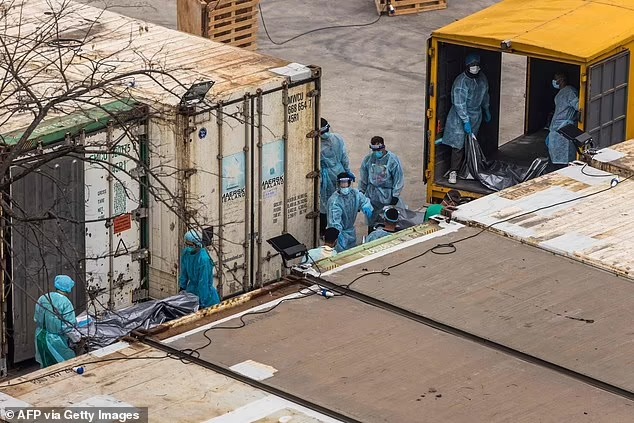 Dailymail đưa tin, các công nhân trong những trang phục bảo hộ y tế đang di chuyển những bệnh nhân tử vong vì Covid-19 nằm trong túi đựng thi thể từ một chiếc xe tải vào các thùng hàng container ở bên ngoài nhà xác công cộng Fu Shan.