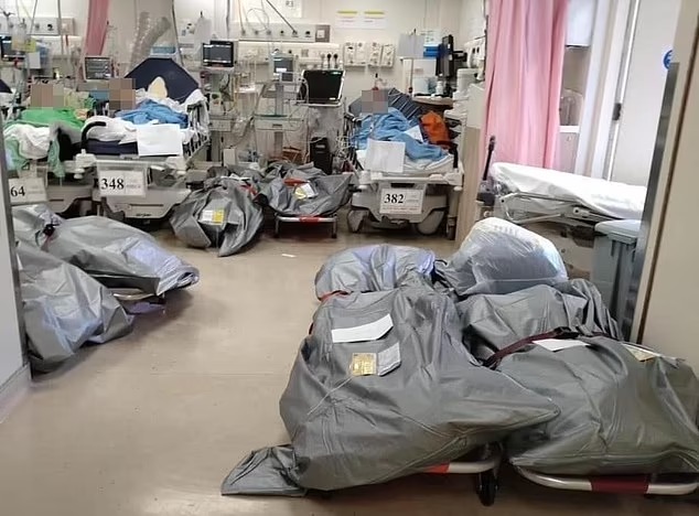 Bức ảnh được cho là chụp vào đầu tháng 3 cho thấy sáu túi thì thể nằm trên cáng cạnh những chiếc giường với người bệnh đang nằm vật lộn vì covid.