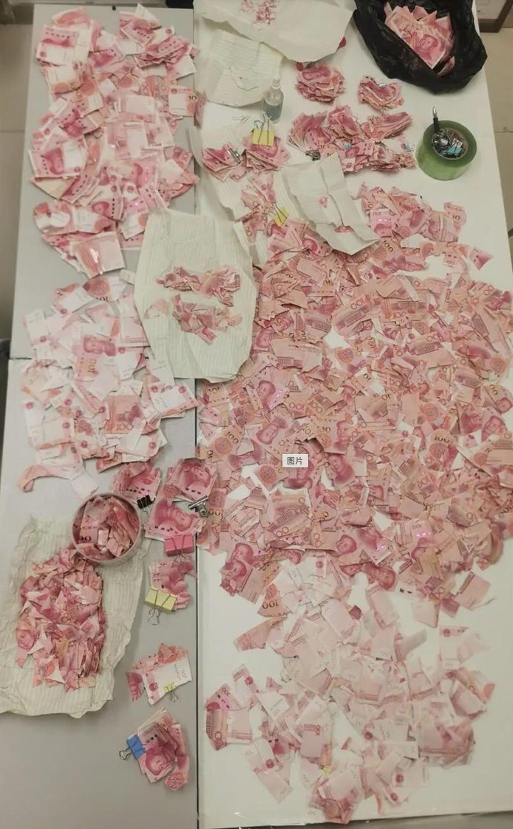 “Đây là lần đầu tiên chúng tôi thấy nhiều tờ tiền cắt vụn ra như vậy. Có hơn 100.000 mảnh, một số tờ thậm chí còn nhỏ hơn cả móng tay. Có ba mệnh giá tiền với các mẫu mã khác nhau và lúc đầu chúng tôi khá bối rối”, một trong những nhân viên ngân hàng cho biết.