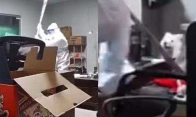 Dù con vật kêu rên rỉ, hai nhân viên y tế vẫn không dừng lại. Mãi khi con vật không còn động đậy, hai nhân viên chống dịch mới rời khỏi căn phòng.