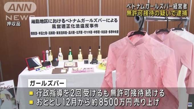 Theo thông tin từ Sở Cảnh sát Thủ đô Tokyo, vào ngày 4/6, họ đã khám xét quán "Việt Nam Bar LAM" tại khu Yushima. Chủ quán, bà Nguyen Thi Phuong Lam (30 tuổi), cùng hai nhân viên đã bị bắt giữ. Các video điều tra cho thấy các tiếp viên trong quán mặc áo dài, tiếp rượu và trò chuyện với khách.