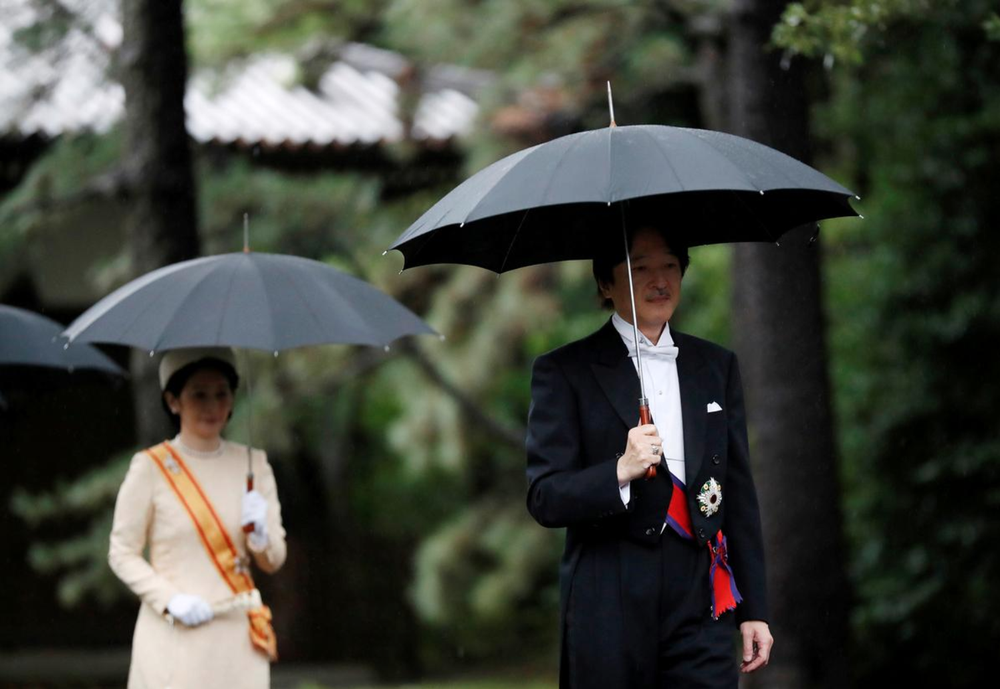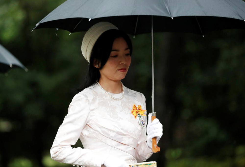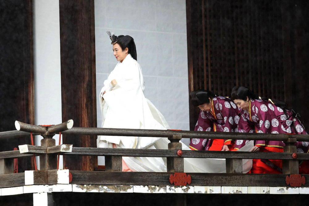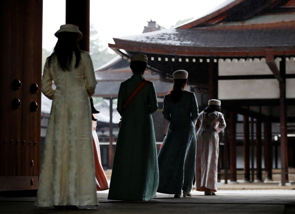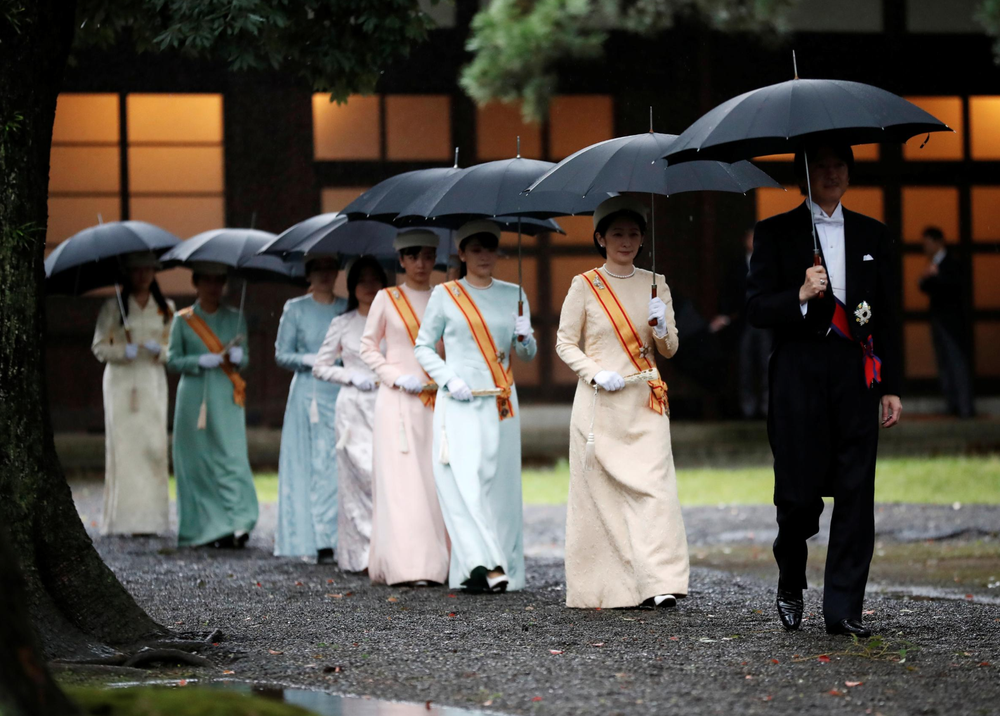 22/10/2019 21:12Nhật Hoàng và Hoàng hậu mặc trang phục trắng chuẩn bị bái tổ tiên trước lễ đăng cơ trong ngày mưa như trút