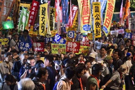 Trước đó, vào tối 18-9, hàng chục ngàn người giận dữ đổ xuống đường để phản đối việc phá vỡ hình ảnh một quốc gia hòa bình. Nhiều người hô vang khẩu hiệu như "Bảo vệ hiến pháp", "Tuyên truyền hòa bình không chiến tranh",...
