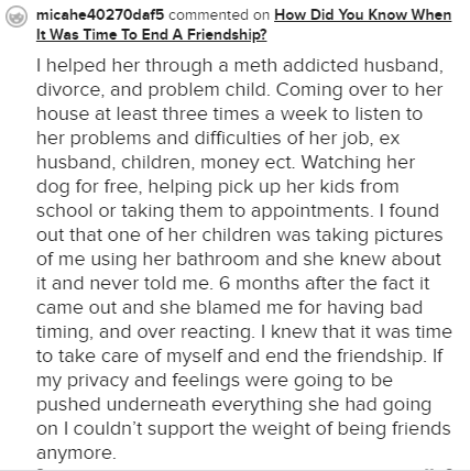 Trong phần bình luận, một tài khoản có tên @micahe40270daf5 đã để lại bình luận dài kể lại tình huống éo le mà cô đã gặp phải với người bạn thân thiết của mình. Cô đã phải quyết định chấm dứt mối quan hệ bạn bè ấy sau rất nhiều cố gắng vun đắp.