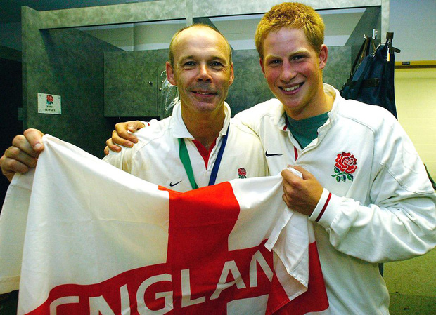 Tháng 11/2003: Hoàng tử Harry, 19 tuổi, ăn mừng chiến thắng trước Australia tại World Cup bộ môn Bóng bầu dục của Anh với huấn luyện viên Clive Woodward.