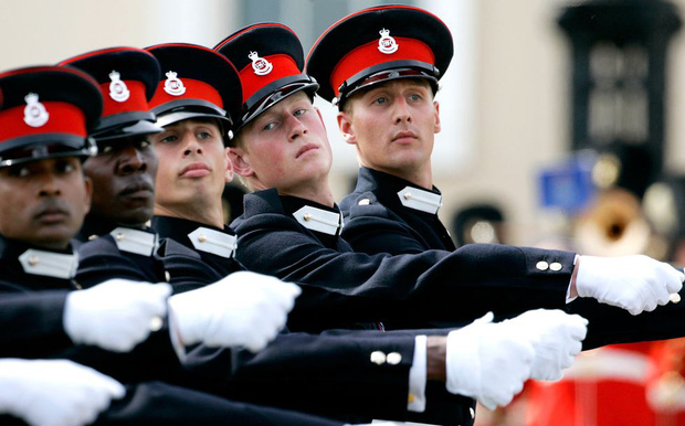 Tháng 6/2005: Hoàng tử Harry diễu hành cùng các học viên quân đội tại Học viện Quân sự Hoàng gia Sandhurst ở Sandhurst, Anh.