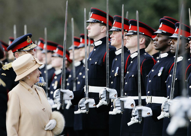 Tháng 6/2006: Nữ hoàng Anh cười với cháu trai - Hoàng tử Harry, 21 tuổi, khi bà bước qua hàng các binh sĩ tại Lễ duyệt binh ở Sandhurst.