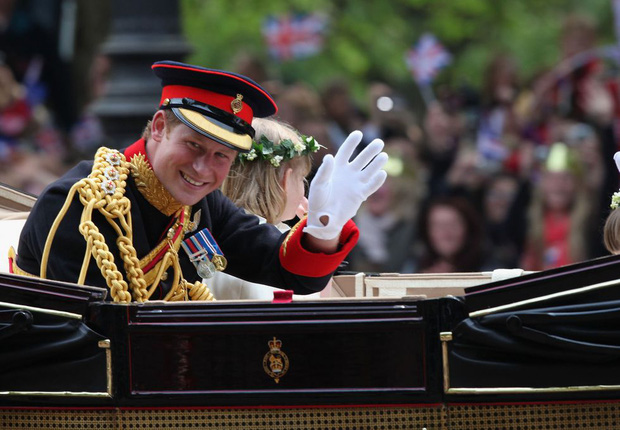 Tháng 4/2011: Hoàng tử Harry, 26 tuổi, trong đám rước tới Cung điện Buckingham từ Tu viện Westminster, nơi diễn ra đám cưới anh trai anh - Hoàng tử William.