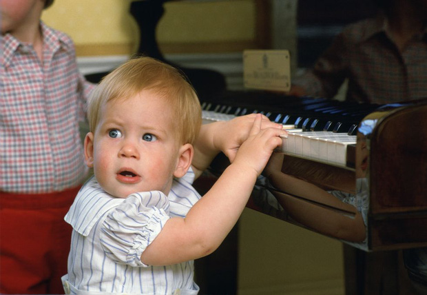 Tháng 10/1985: Hoàng tử Harry, 1 tuổi, chơi piano tại nhà cùng anh trai William trong Cung điện Kensington.