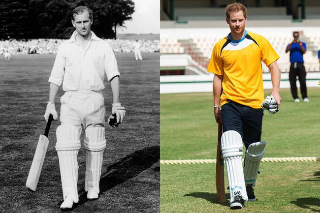Hoàng tế Philip tại trận đấu cricket nổi tiếng ở Arundel, tháng 8/1953; Harry trong một trận đấu cricket trong chuyến thăm chính thức ở Castries, Saint Lucia, tháng 11/2016.
