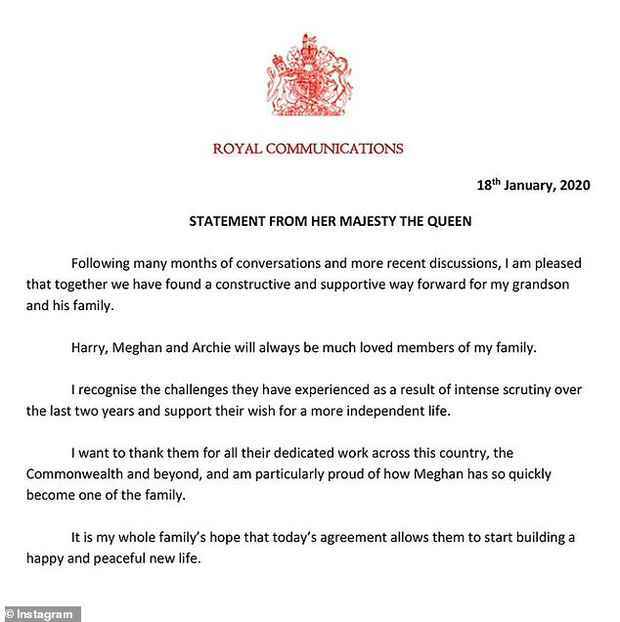 Nội dung của tuyên bố nói rằng: "Sau nhiều tháng nói chuyện và thảo luận gần đây, tôi rất hài lòng rằng gia đình chúng tôi đã cùng nhau tìm ra được con đường có tính xây dựng và ủng hộ cho cháu tôi và gia đình cháu. Harry, Meghan và Archie sẽ luôn được gia đình yêu thương. Tôi nhận ra những thử thách mà họ gặp phải là kết quả của sự soi mói mạnh mẽ trong 2 năm qua và tôi ủng hộ ước muốn có được cuộc sống độc lập hơn của chúng. Tôi muốn cảm ơn chúng vì những việc làm tận tâm trên khắp đất nước, Khối Thịnh vượng chung và hơn thế nữa, và tôi đặc biệt tự hào vì Meghan đã nhanh chóng trở thành người trong gia đình. Gia đình tôi hi vọng rằng thỏa thuận của ngày hôm nay cho phép chúng xây dựng một cuộc sống mới hạnh phúc và bình yên".