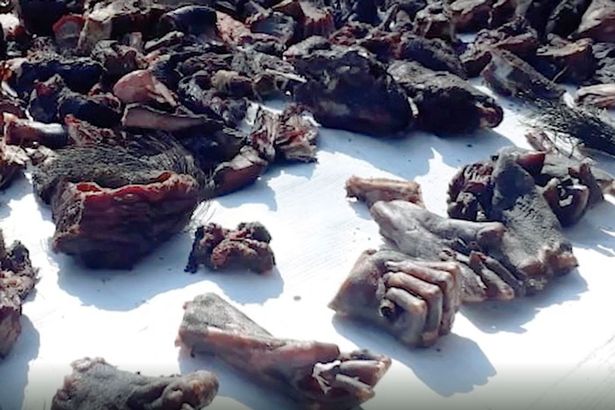 Bức ảnh cho thấy những bàn tay khỉ bị chặt đứt và cả các bộ phận khác của con vật này được bày bán tràn lan, vi phạm nghiêm trọng luật bảo vệ động vật hoang dã và quyền động vật.