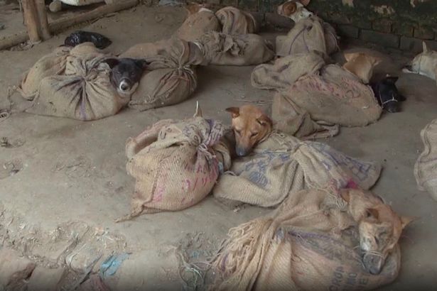 Những con chó thở hổn hển khi bị trói nhốt trong bao tải ở Keera Bazaar, thậm chí một cảnh quay kinh dị khác cho thấy cái đầu bị chặt đầu của một chú chó nằm lăn lóc trên mặt đất, những con ruồi bay khắp nơi.