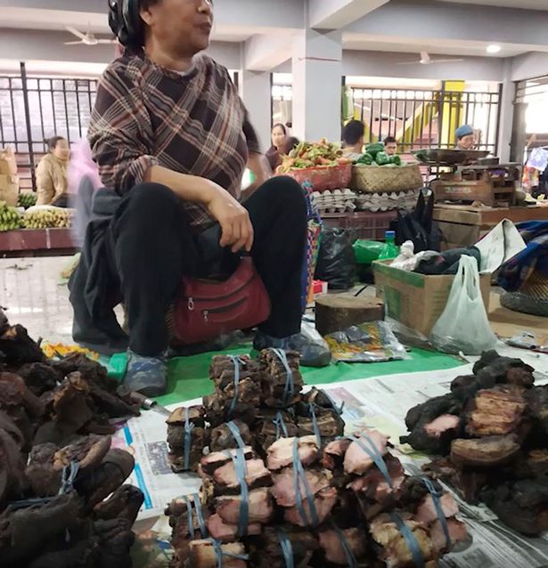 Tại chợ Churachandpur, những bàn tay được cho là tay khỉ này được xếp kế nhau, cạnh đó là những tảng thịt lớn.