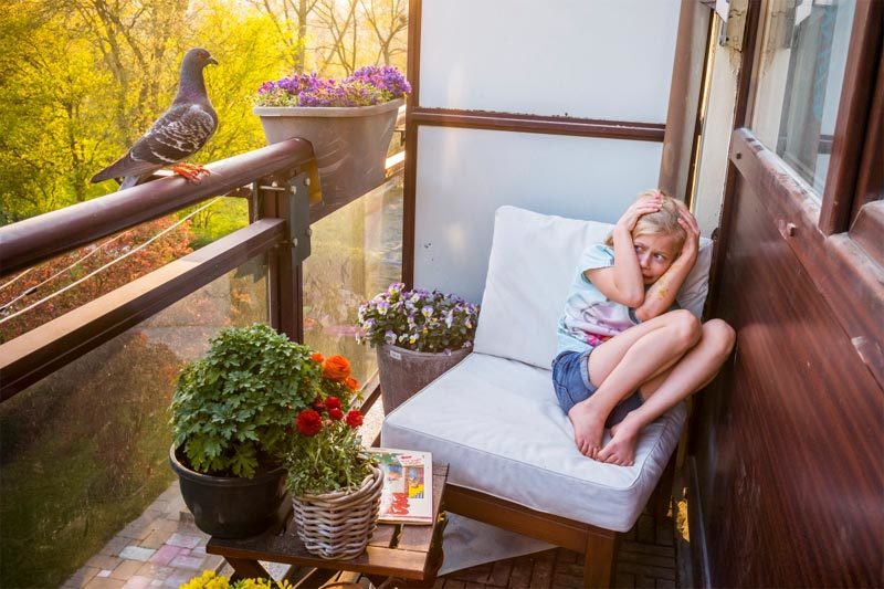 Thiên nhiên – Giải nhất, Câu chuyện: Con gái nhiếp ảnh gia Merel thu mình khi bồ câu bay tới và đậu trên ban công, trước khi vào nhà, ở Vlaardingen, Hà Lan, ngày 6/4/2020. [Jasper Doest, Hà Lan]