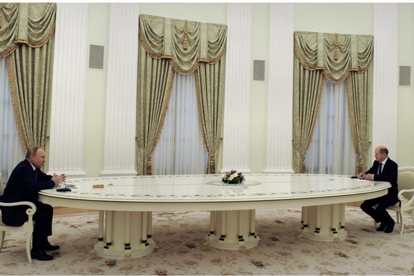 Theo Forbes, người đứng đầu nước Nga đã tiếp Tổng thống Pháp Macron, Thủ tướng Đức Olaf Scholz tại chiếc bàn gỗ sơn mài dài 6m.