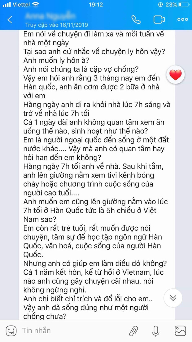 "...Sau khi em trở về nhà, hằng ngày anh nhắn rất nhiều tin nhắn hành hạ tinh thần em... Thực sự là quãng thời gian đáng sợ, lúc nào anh cũng nói ly hôn đi... Bên cạnh đó từ khi em sang Hàn Quốc, anh chưa từng cho em gặp gia đình anh".
