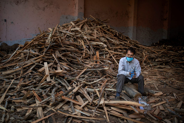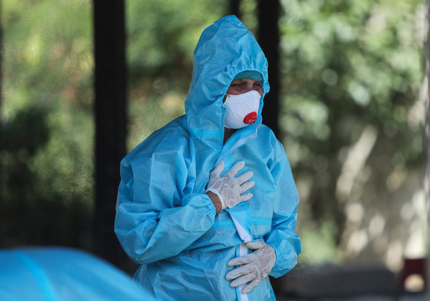 Công nhân mệt mỏi, kiệt sức sau khi mang quá nhiều xác chết đi hỏa táng, đang ngồi trên bậc sau của xe cấp cứu bên trong một lò hỏa táng, ở New Delhi, Ấn Độ.