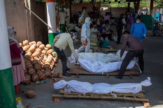 Một xác chết chờ được hỏa táng tại một khu đất đã được chuyển thành lò hỏa táng để hỏa thiêu hàng loạt nạn nhân Covid-19 ở New Delhi, Ấn Độ