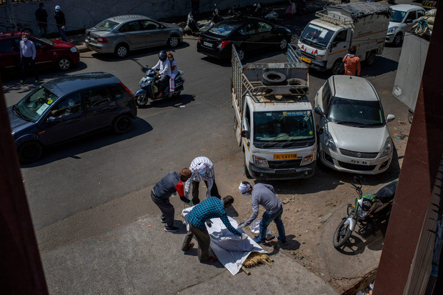 Các thành viên trong gia đình của một nạn nhân COVID-19 phủ tấm vải liệm lên thi thể nằm trên đường đang đợi để vào trong lò hỏa táng ở New Delhi, Ấn Độ