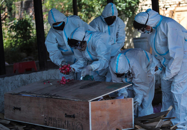 Người thân và công nhân thành phố mặc đồ bảo hộ, đang chôn thi thể một người tử vong do COVID-19 ở Gauhati, Ấn Độ.