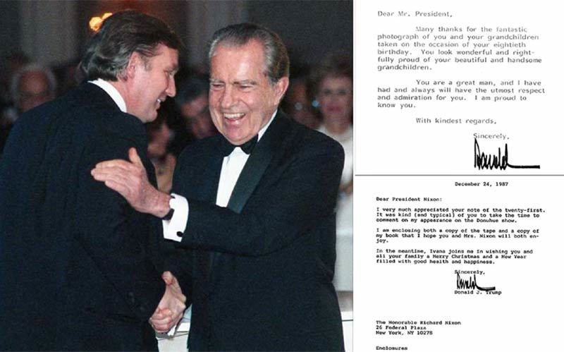 "Tôi nghĩ ngài là một trong những người vĩ đại của đất nước này, và thật vinh dự khi có một buổi tối với ngài", ông Trump viết cho Nixon vào tháng 6/1982, khoảng 8 năm sau khi Nixon từ chức tổng thống trong vụ bê bối Watergate. Hai người được phát hiện cùng nhau tại hộp đêm "21", và Trump viết thư cho Nixon để cảm ơn vì đã chuyển tiếp một bức ảnh.