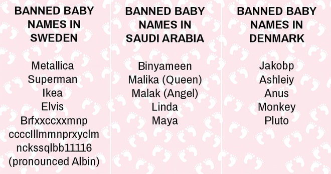 5. Cha mẹ chỉ có thể đặt tên cho con nếu nó nằm trong danh sách tên con đã được phê duyệt trước ở Đan Mạch, Bồ Đào Nha, Iceland và Hungary