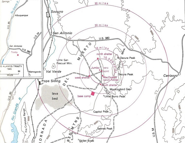 Địa điểm diễn ra cuộc thử nghiệm Trinity nằm cách thành phố Los Alamos thuộc bang New Mexico khoảng 337km về phía nam. Người dân sinh sống ở khu vực này bị kiểm soát và hạn chế nghiêm ngặt về thông tin họ có thể tiết lộ về Trinity.