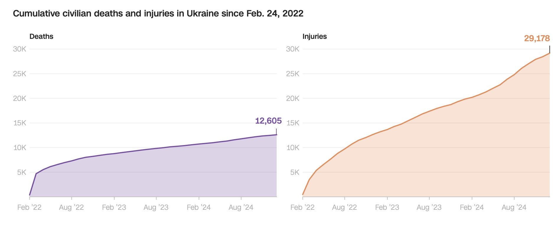 Theo Văn phòng Nhân quyền Liên Hợp Quốc, hơn 40.000 dân thường đã thiệt mạng hoặc bị thương ở Ukraine trong cuộc xung đột, trong đó nhiều trường hợp tử vong do vũ khí nổ. Ít nhất một nửa số người thiệt mạng (6.203 người) là nam giới trưởng thành và 669 là trẻ em.