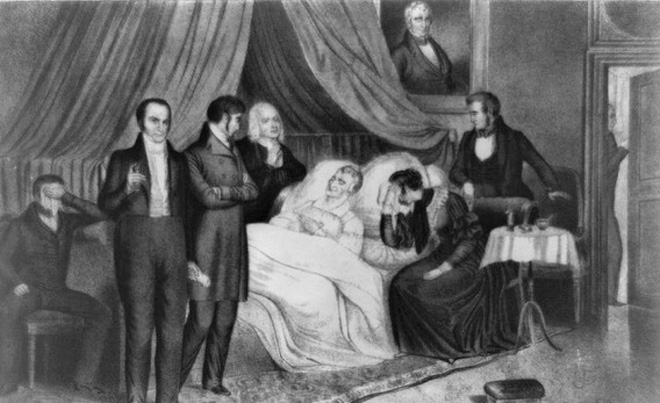 William Henry Harrison trở thành Tổng thống tại vị ngắn nhất khi qua đời chỉ 34 ngày sau khi nhận nhiệm sở vì bệnh viêm phổi mà ông mắc phải vào ngày nhậm chức. Ông là Tổng thống đầu tiên qua đời khi còn đương nhiệm, có nghĩa là chưa có tiền lệ cho việc Phó Tổng thống John Tyler lên nắm quyền.