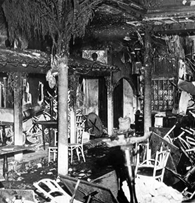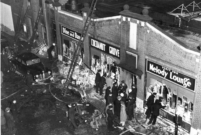 Vụ cháy xảy ra đúng vào ngày Lễ Tạ ơn, câu lạc bộ đêm Cocoanut Grove đón một lượng khách nhiều gấp đôi sức chứa của nó. Một cặp tình nhân trẻ do muốn có khoảng không gian riêng tư nên đã dẫn nhau ra phía sau tấm màn nhung che quanh sân khấu rồi tháo cái bóng đèn chiếu sáng để “tâm sự”. Khi thấy hậu trường sân khấu tối đen, Dick Chaney, nhân viên phục vụ theo lệnh ông chủ Welansky bước đến xem xét và sau đó, anh ta đánh một que diêm tìm cái bóng đèn bị đôi tình nhân bỏ xuống sàn nhà. Do bất cẩn, ngọn lửa từ que diêm bén vào tấm màn nhung rồi càng lúc càng lan rộng.