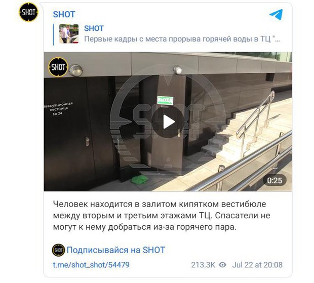 Chẳng hạn Kênh Telegram SHOT đăng tải một đoạn video ngắn được cho là quay tại hiện trường. Đoạn video cho thấy các nhân viên y tế đang điều trị cho những khách hàng và nhân viên trung tâm thương mại bị thương tại hiện trường, trong khi hơi nước nóng vẫn bốc ra từ cửa của tòa nhà.