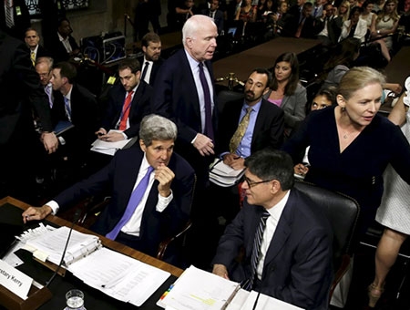 Ngoại trưởng John Kerry (trái) trao đổi với Bộ trưởng Tài chính Jack Lew (phải) thảo luận trong giờ nghỉ một phiên họp ở Ủy ban Quân vụ Thượng viện hôm 29/7. Phía trên là Thượng nghị sĩ đảng Cộng hòa John McCain và Thượng nghị sĩ đảng Dân chủ Kirsten Gillibrand. Ảnh: Reuters. |