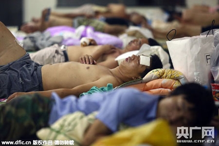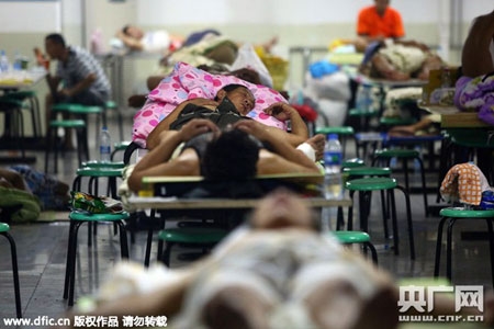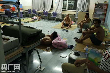 Người dân ngủ trong lớp học. Do diện tích trường có hạn, nhiều người phải mang theo chăn, màn và đồ dùng thiết yếu để ngủ ngoài đường. |