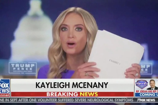 "Chúng tôi vẫn liên tục nghe câu hỏi 'Bằng chứng ở đâu?'. Và bằng chứng ở ngay đây!" - thư ký báo chí Nhà Trắng Kayleigh McEnany nói với người dẫn chương trình trên Đài Fox News ngày 10-11, và giơ lên một xấp tài liệu.