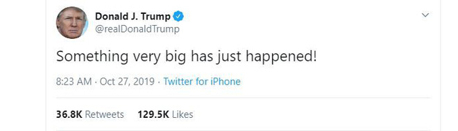 27/10/2019 21:25[NÓNG] Thủ lĩnh IS nổ bom tự sát cùng 2 bà vợ, TT Trump bất ngờ đăng tweet khó hiểu
