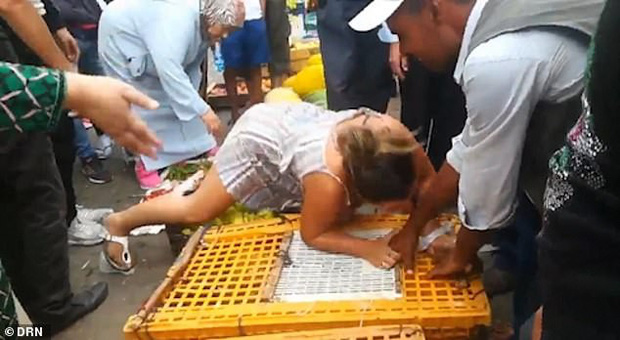 | Đoạn clip ghi lại cảnh cô gái cắn tay người bán gà ở Morocco. (Nguồn: Dailymail) |