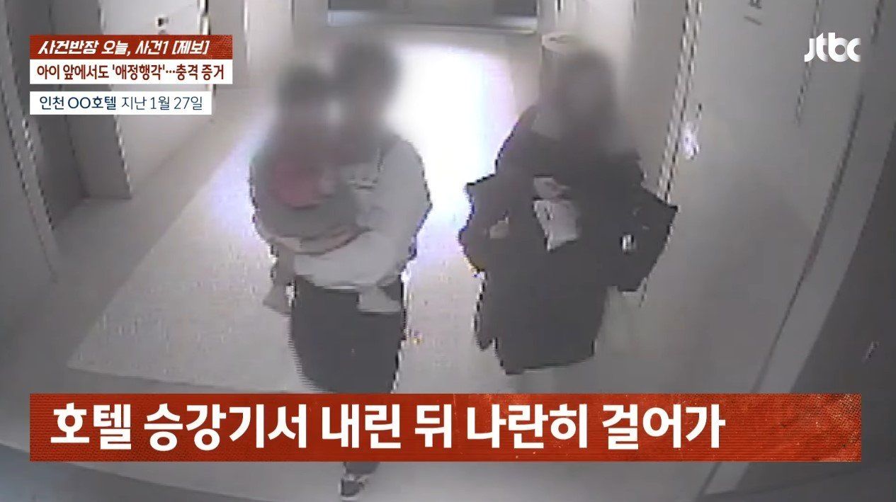 Camera an ninh đã ghi lại hình ảnh người vợ đang chuẩn bị làm thủ tục nhận phòng tại khách sạn, trong khi đứa con trai 2 tuổi và học sinh nam đứng bên cạnh. Học sinh nam ban đầu định ôm đứa bé nhưng lại quay sang ôm chầm lấy người phụ nữ, thể hiện tình cảm thân mật như một cặp đôi. Trong nhà hàng của khách sạn, cô đứng dậy từ ghế và hôn lên trán học sinh nam một cách ngọt ngào.
