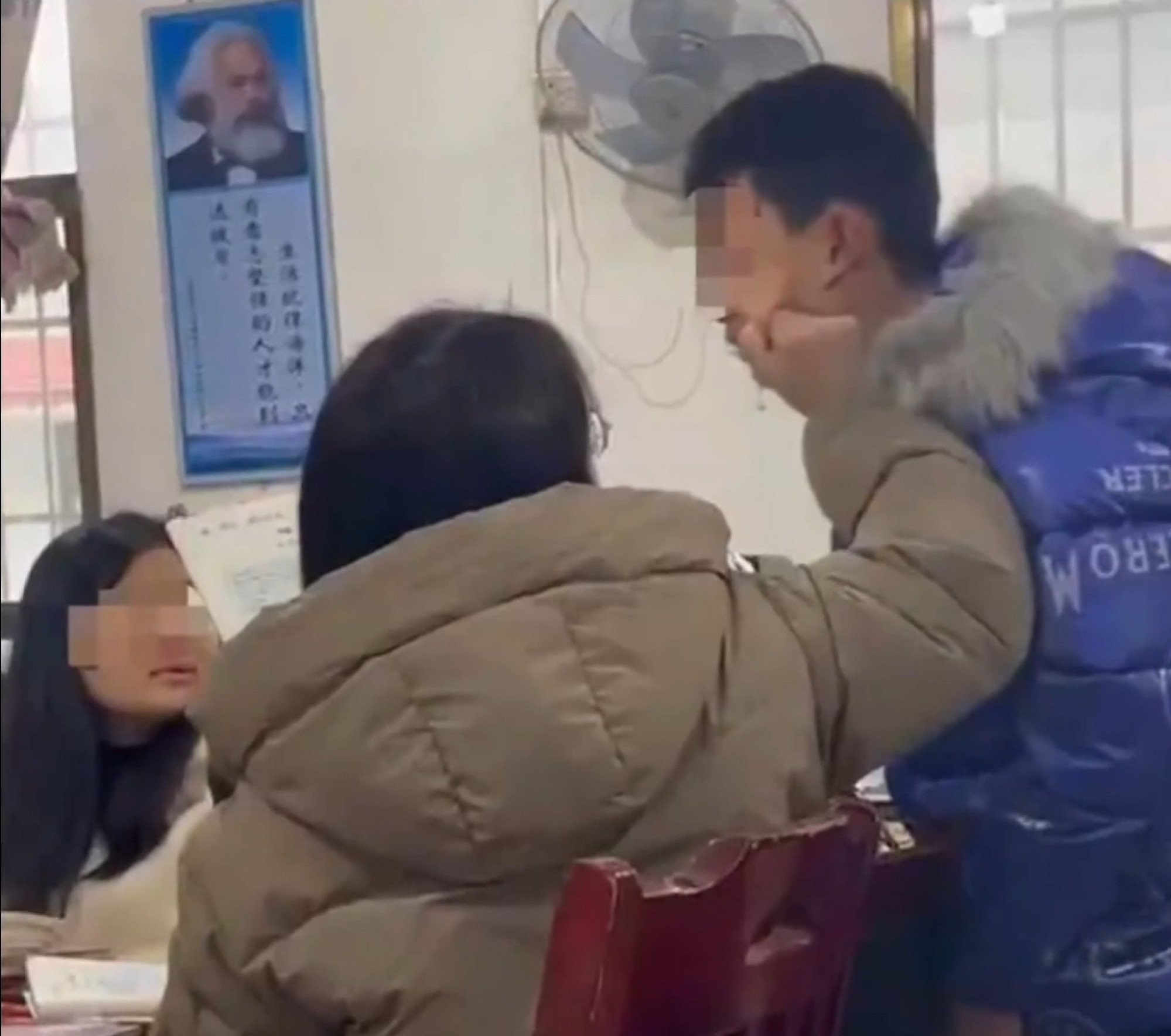 Sau đó, người giáo viên bắt đầu chuyển sự chú ý của cô sang cậu bé vừa nộp bài tập về nhà. Trong lúc đó, cô giáo quay sang giảng bài cho nam sinh, người nữ giáo viên liền đấm luôn vào mặt cậu bé và ném vở bài tập của nữ sinh vào người cậu. Thấy vậy, cô bé lặng lẽ nhặt quyển vở lên.