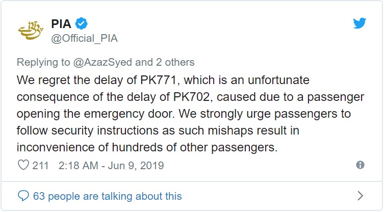 Theo nguồn tin của tờ The Independent, gần 40 người trên chuyến bay đã phải chờ đợi đến tận 5 giờ sáng hôm sau mới có thể bắt đầu đi đến Islamabad. Dữ liệu từ trang FlightRadar24 cũng cho thấy 4:59 sáng họ mới cất cánh thay vì 9:20 tối hôm trước như dự định.