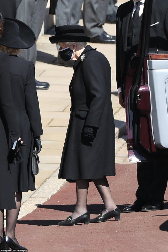 Nữ hoàng đứng lặng trong một vài giây bên cạnh linh cữu chồng, từ giây phút này, họ mãi mãi chia xa nhau. Nữ hoàng Anh đã rất mạnh mẽ trong suốt thời gian qua. Bà là người quyết định các khâu chuẩn bị để tiễn biệt chồng mình. Bà đã tham gia 2 nhiệm vụ chính thức và lặng lẽ đi dạo trong lâu đài.