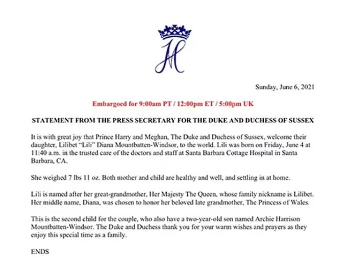 Harry và Meghan, hiện sống ở California thông báo về sự chào đời của con gái hôm 6/6. Nữ hoàng, vợ chồng Thái tử Charles và nhà William - Kate đã gửi lời chúc mừng tới họ.