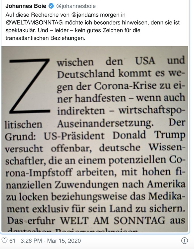 Phát biểu này được đưa ra khi những ngày gần đây, nhật báo Welt am Sonntag (Đức) tiết lộ việc Tổng thống Mỹ Donald Trump sẵn sàng trả giá cao để mua lại công nghệ sản xuất vắc-xin phòng Covid-19, thậm chí mua lại chính công ty CureVac. Một bài viết đăng trên tờ Die Welt (Đức) trích dẫn các nguồn tin thân cận với chính phủ Đức về việc Tổng thống Trump đề nghị trả CureVac khoảng 1 tỉ USD để có thể tiếp quản quy trình sản xuất đồng thời bảo đảm vắc-xin "chỉ dành riêng cho Mỹ".