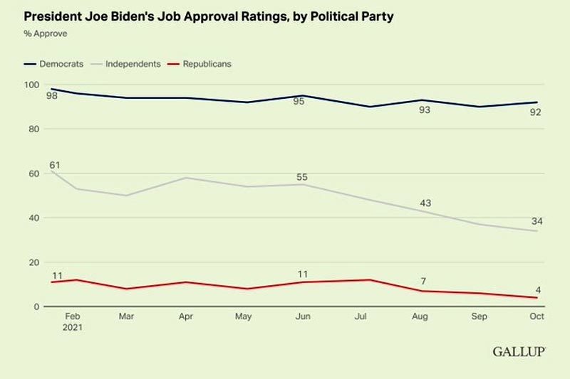 Theo cuộc thăm dò dư luận mới của Gallup, chỉ 42% cử tri được hỏi ủng hộ những gì ông Biden đã làm trên cương vị lãnh đạo Chính phủ Mỹ trong tháng 10. Mức tín nhiệm trung bình dành cho ông trong quý thứ 3 của nhiệm kỳ tổng thống hiện tại là 44,7%, giảm mạnh so với mức 56% ở 3 tháng đầu nhậm chức.