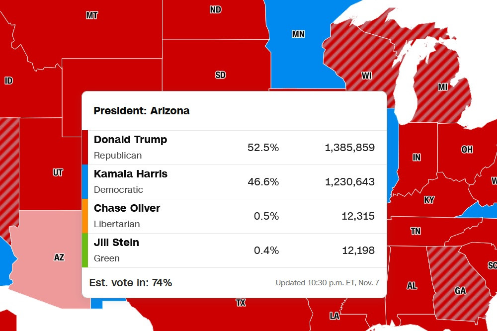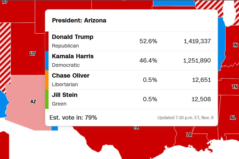 Hai kênh truyền thông lớn là CNN và NBC News cho biết, đã có 79% phiếu bầu phổ thông ở bang Arizona được kiểm tính tới 19h18 tối 8/11 (giờ Mỹ). Trong đó, ông Trump giành 1.419.337 phiếu ủng hộ, tương đương 52,6% số phiếu đã được kiểm.