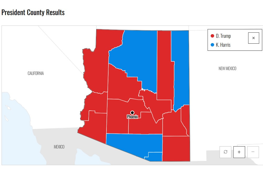 Theo bảng số liệu từ NBC News, bà Kamala Harris chỉ dẫn trước ông Trump tại 3 quận Pima, Coconino và Apache thuộc bang Arizona. Trong khi đó, ông Trump nhận được sự ủng hộ từ cử tri tại tất cả các quận còn lại trong bang Arizona.